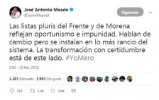 | José Antonio Meade candidato presidencial del PRI a través de un mensaje en su cuenta de Twitter criticó las listas de candidatos plurinominales de PAN, PRD... 2018-02-19 14:21:24 |