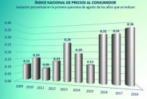 | En 2017 la inflación de la primera quincena de agosto fue de 0.31 y la tasa anual llegó a 6.59.