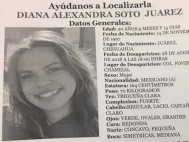 | Diana Alexandra Soto Juárez, de 20 años de edad, fue vista por última vez el 28 de agosto en la colonia Fovissste Chamizal, alrededor de las 18:00 horas, en... 2018-08-29 17:05:37 |