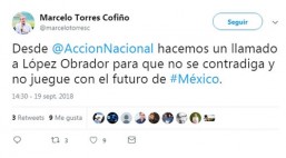 | El dirigente del PAN, Marcelo Torres Cofiño, dijo al presidente electo Andrés Manuel López Obrador, que ya basta de juegos, ocurrencias y contradicciones. ... 2018-09-19 16:01:01 |