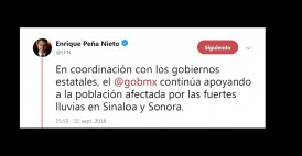 | A través de su red social expuso que “en coordinación con los gobiernos estatales, el gobierno de México continúa apoyando a la población afectada por las f... 2018-09-21 19:02:39 |