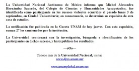Suman 27 expulsados de la UNAM por ataque en CU |
