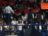 | Excluidos del foro quedaron unos 300 trabajadores de la educación, quienes protestaron por no poder ingresar