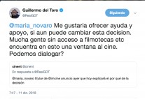 | Del Toro -vía Twitter- escribió a María Novaro, titular del Instituto Mexicano de Cinematografía (Imcine), que podría ayudar a su rescate. 2018-12-11 20:28:49 |
