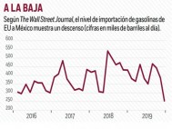 | Según The Wall Street Journal, el nivel de importación de gasolinas de EU a México muestra un descenso (cifras en miles de barriles al día)