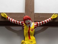 | Cientos de católicos protestaron luego de que se mostrara a un payaso de una famosa cadena de restaurantes de comida rápida crucificado