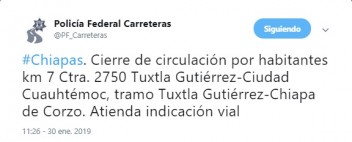 | Explicaron que los cierres comenzaron desde las 7:00 horas, tiempo local, en la vía Tuxtla Gutiérrez-Chiapa de Corzo, a la altura del puente Belisario Domín... 2019-01-30 13:26:43 |