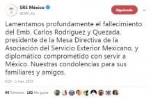 | Rodríguez y Quezada fue funcionario diplomático por 42 años y fungió como embajador de México en Serbia, fue cónsul general alterno en Nueva York, entre otr... 2019-03-01 11:27:33 |