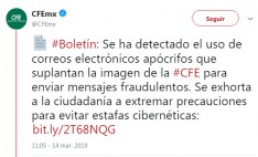 | La CFE alertó que los correos electrónicos de tipo “phishing” imitan su diseño y colores oficiales para generar confianza en los usuarios, quienes creen de ... 2019-03-14 15:41:28 |