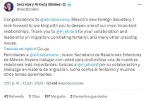 Felicita Antony Blinken a Alicia Bárcena por su llegada a la SRE |