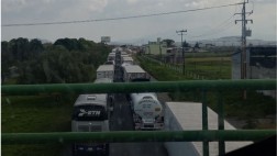 | Las filas de camiones y automóviles detenidos se extiende por decenas de kilómetros debido a que el tráfico está completamente colapsado