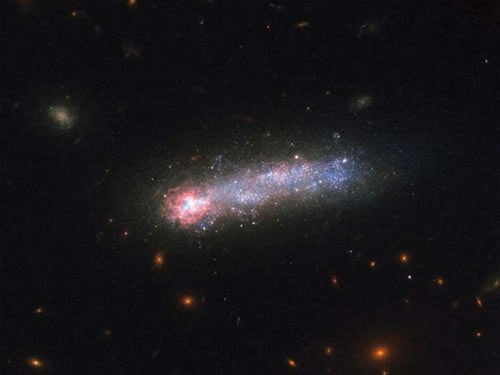 | La imagen muestra una tormenta de fuego por la creación de nuevas estrellas que ilumina un extremo de la galaxia enana Kiso 5639 | ||||||