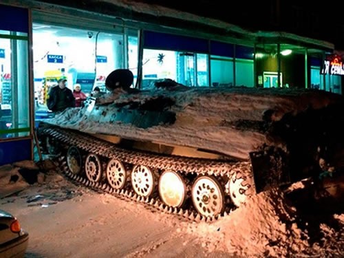 .- Un hombre ebrio tomó control de un vehículo blindado el miércoles y chocó contra la vidriera de una tienda en el noroeste de Rusia, en un incidente que no causó heridos, informó la policía.