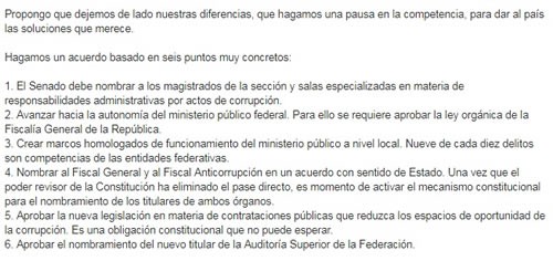 En un mensaje emitido esta mañana, reproducido en su cuenta en Twiiter, Meade sostuvo que la justicia no debe depender de quien gane la Presidencia de la República y que los partidos deben hacerse cargo “de inmediato de este pendiente estructural”. Abundó: “Nadie tiene derecho a posponer estas decisiones con la intención de capturar a las nuevas instituciones. Si hay un compromiso con el país, el periodo legislativo que inicia es una buena oportunidad para avanzar en esta tarea”. El ex secretario de Hacienda consideró que el problema central del país es la impunidad y reiteró que en México, es altamente probable que quien cometa un delito o incurra en actos de corrupción, no sea sancionado. “La impunidad alienta la corrupción, es la causa de la inseguridad y la fuente principal de la violación a los derechos humanos”, indicó. Meade aprovechó para reiterar sus críticas a Andrés Manuel López Obrador y a Ricardo Anaya, sus opositores de las alianzas Juntos Haremos Historia y Por México al Frente, sin mencionarlos explícitamente. Dijo: “Unos proponen perdonar a los delincuentes. Otros simplemente no hablan del tema porque carecen de ideas y de la experiencia suficiente para terminar con el grave ciclo de impunidad que vive el país… Ni el perdón ni las ocurrencias para el aplauso fácil son la solución”. No obstante, planteó a los otros partidos dejar de lado las diferencias y hacer “una pausa en la competencia”, para consolidar las instituciones del sistema anticorrupción y realizar los nombramientos. El acuerdo que propuso Meade es alrededor de seis puntos: -Que el Senado nombre a los magistrados de la sección y salas especializadas en materia de responsabilidades administrativas por actos de corrupción. -Se avance hacia la autonomía del Ministerio Público Federal. Refirió que para ello se apruebe la ley orgánica de la Fiscalía General de la República. -Crear marcos homologados de funcionamiento del Ministerio Público a nivel local, porque nueve de cada diez delitos son competencias de las entidades federativas. -Nombrar al fiscal general y al fiscal anticorrupción “en un acuerdo con sentido de Estado. Una vez que el poder revisor de la Constitución ha eliminado el pase directo, es momento de activar el mecanismo constitucional para el nombramiento de los titulares de ambos órganos”. -Aprobar la nueva legislación en materia de contrataciones públicas que reduzca los espacios de oportunidad de la corrupción, porque se trata de una obligación constitucional que no puede esperar. -Y elegir al nuevo titular de la Auditoría Superior de la Federación. |