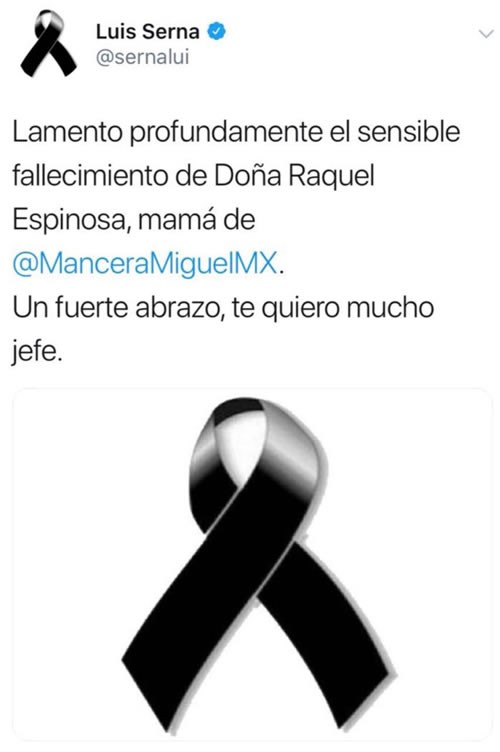 | Esta madrugada murió la mamá la señora Raquel Espinosa, mamá del jefe de Gobierno de la Ciudad de México, Miguel Ángel Mancera Espinosa. |