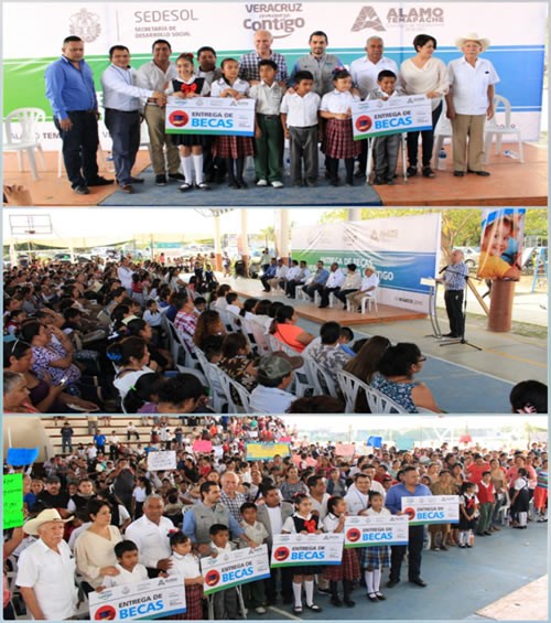El evento tuvo lugar en la Unidad Deportiva acudiendo alumnos beneficiados de los municipios de Álamo y Cerro Azul, siendo los alumnos de Álamo los mayormente beneficiados al contabilizarse ochocientas treinta siete becas. “Me da mucho gusto ver a tantas niñas y niños que acompañados de sus papás recibirán las becas que les darán posibilidades para la compra de sus útiles escolares y da gusto ver las sonrisas de los niños y el deseo enorme de seguir estudiando” indicó en rueda de prensa. Al término del evento Jorge Vera Hernández declaró que el gobierno municipal lleva a cabo políticas públicas para fortalecer la educación, la salud, el deporte y la cultura pues el compromiso de este nuevo gobierno va encaminado al restablecimiento del tejido social en el municipio. Dijo que aprovechando la presencia de tanto niño en la entrega de becas preguntó a niñas y niños que uniforme preferían y que, todos al unísono, se manifestaron por el uniforme de deportes en lugar del uniforme de gala. Expuso que en consecuencia se habrán de repartir gratuitamente doce mil quinientos uniformes en la última semana del mes de agosto para todo alumno en el municipio de preescolar y primaria y que cada uniforme constará de un short, un pant, una playera y una sudadera. Seguidamente habló sobre las becas municipales denominadas “Estímulos para la educación” que habrá de beneficiar a más de dos mil quinientos alumnos que tengan un buen promedio e informó sobre otros apoyos que habrán de darse en el “Día de la Familia” cuando se comience con la promoción de los juegos tradicionales (Trompo, yoyo, canicas, rondas infantiles, etc.) dándole mantenimiento al monumento al juguete y trabajando sobre los juegos tradicionales que permitirán una verdadera interacción entre los niños. |