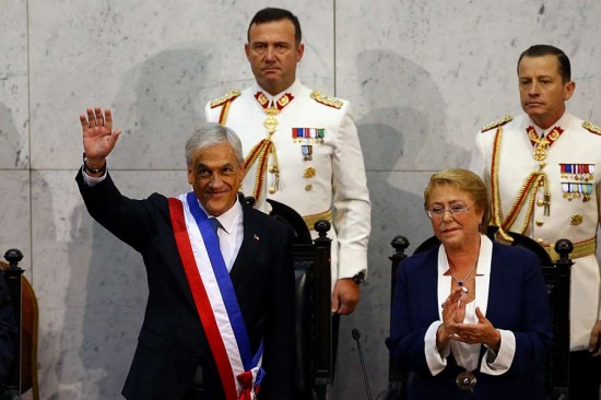 La del domingo es la segunda ocasión en que Bachelet le entrega el poder al multimillonario ingeniero comercial. Cumpliendo un estricto protocolo, Bachelet llegó 15 minutos antes del mediodía al Congreso, en el vecino puerto de Valparaíso, a bordo de un vehículo descubierto, en medio de algunos gritos de “presidenta la amamos” y “Gracias presidenta”. Minutos después del mediodía la mandataria se sacó la banda presidencial y una insignia de mando y se los pasó al recién electo presidente del senado, el socialista Carlos Montes, quien procedió a investir a Piñera. Entre los más de mil 300 invitados a la ceremonia estaban los presidentes de Argentina, Mauricio Macri; Bolivia, Evo Morales; Brasil, Michel Temer; Ecuador, Lenín Moreno; Honduras, Juan Orlando Hernández; México, Enrique Peña Nieto; Perú, Pedro Pablo Kuczynski y el rey emérito Juan Carlos 1 de España. Tras un fuerte “sí juro” y luego que Piñera recibiera la banda presidencial y una insignia dorada, quedó instalado como el mandatario, que gobernará hasta 2022, quien procedió a tomar juramento a sus 23 ministros. Piñera llega al poder apoyado por la coalición Chile Vamos, integrada por la conservadora Unión Demócrata Independiente (UDI), la centroderechista Renovación Nacional (RN) y dos colectividades menores. La UDI y RN fueron el sustento político de la dictadura del general Augusto Pinochet entre 1973 y 1990. Su principal desafío es alinear a su coalición”, dijo el sociólogo y analista político Miguel Zlosilo, en alusión a Chile Vamos, que en el pasado ha actuado más como pacto electoral que como coalición política y a la que Piñera exhortó a trabajar unida. Hay que ver si efectivamente la derecha, por primera vez en la historia tiene capacidad de trabajo en equipo... y proyectarse para un siguiente período”, añadió. Piñera, de 68 años, prometió retomar el crecimiento económico, impulsar las ralentizadas inversiones, mejorar los empleos y la seguridad pública e impulsar leyes que protejan a la infancia y regulen la creciente inmigración extranjera. Durante el segundo mandato de Bachelet, entre 2014 y 2018, el crecimiento económico cayó a un promedio del 2%. Piñera afirma que la experiencia adquirida en su primer gobierno, entre 2010 y 2014, le servirá para buscar acuerdos nacionales con una fraccionada centroizquierda. Desde el día uno Piñera va a querer demostrar que con él la rueda de la economía volvió a girar”, dijo a Cristóbal Bellolio, profesor de la Escuela de Gobierno de la Universidad Adolfo Ibáñez. Durante su primer gobierno Chile creció un 5.3% y creó un millón de empleos, empujados por la reconstrucción del centro sur chileno, devastado dos semanas antes de que asumiera el mando por un terremoto de magnitud 8.8 seguido de un devastador tsunami. Aunque Piñera derrotó al candidato de centroizquierda Alejandro Guillier con el 54% de los votos, frente al 45% de su rival, tendrá un congreso sin mayorías. Deberá asumir, con o sin modificaciones, una serie de proyectos que Bachelet dejó en el congreso, incluido uno de matrimonio igualitario que para Piñera es inaceptable porque afirma que éste sólo debe ser entre un hombre y una mujer. También deberá abordar reformas educacionales pendientes con las que Bachelet logró favorecer al 60% de los estudiantes universitarios más pobres y que aspiraba a alcanzar la gratuidad universal, rechazada por Piñera, quien sin embargo no cuenta con la mayoría necesaria para deshacer las modificaciones emblemáticas de la saliente mandataria. Creo que vamos a estar en una lógica más menos de obrar sobre lo construido, por una parte, y por otra hacer una serie de ajustes a reformas que no están bien hechas”, concluyó Bellolio. Entre las reformas que necesitan modificaciones están la tributaria, de educación y laboral, según el analista. Si (Piñera) logra el alineamiento de su coalición le va a ir bien en todas las materias”, afirmó Zlosilo. |