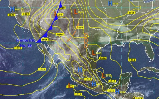 El frente frío originará vientos fuertes de dirección variable de 20 a 35 kilómetros por hora con rachas que pueden superar los 70 kilómetros por hora y posibles tolvaneras en Sonora, Chihuahua, Coahuila, Nuevo León, Sinaloa, Durango y Zacatecas. Se prevé cielo medio nublado con lloviznas aisladas en Chihuahua y Coahuila. El registro más reciente de la Comisión Nacional del Agua también estableció que prevalecerá cielo nublado, con vientos del oeste y rachas superiores a 50 kilómetros por hora en Baja California, aunque se tendrá un ambiente templado durante el día. Para la madrugada se prevé caída de aguanieve o nieve en la sierra de la Rumorosa, Baja California. Para el Pacífico Norte se espera un cielo medio nublado. En el Golfo de California se tendrá un ambiente templado y el viento del oeste contará con rachas superiores a 70 kilómetros por hora. Se prevén posibles tolvaneras en Sonora y Sinaloa En el Pacífico Centro el cielo estará despejado la mayor parte del día. El ambiente será caluroso y el viento de dirección variará de 10 a 20 kilómetros por hora con rachas superiores a 30 kilómetros por hora. Habrá cielo medio nublado con lloviznas aisladas acompañados de actividad eléctrica en Oaxaca y Chiapas. A esto se sumará ambiente caluroso a muy caluroso con un viento de dirección variable de 20 a 35 kilómetros por hora. Mientras que en el Golfo de México persistirá cielo nublado por la tarde con lloviznas aisladas en Veracruz y Tamaulipas, se tendrá un ambiente caluroso en la región y el viento del sur y sureste irá de 10 a 25 kilómetros por hora con rachas mayores a 40 kilómetros por hora. Para la Península de Yucatán se tendrá cielo despejado y ambiente de caluroso a muy caluroso; se pronostica viento del sureste de 20 a 35 kilómetros por hora. En la Mesa Central predominará cielo medio nublado por la tarde con lloviznas aisladas en Puebla. Además de un ambiente cálido a lo largo del día y viento de dirección variable de 10 a 35 kilómetros por hora. |