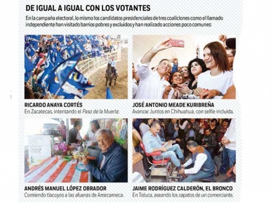 Según expertos, estos actos de los candidatos son para “humanizarse”: ser o parecer más cercanos a la gente, lo que se conoce como “baños de pueblo”. Los “baños de pueblo buscan generar empatía con la población, sólo para adquirir el voto. Los llamados baños de pueblo son acercamientos falsos que los candidatos realizan asesorados por sus equipos de campaña para crear un showman. “El objetivo es generar empatía, es un rasgo populista, con la intención de generar cercanía con el pueblo. En América Latina hemos visto estas formas de acercamiento con la gente, como lo hizo Hugo Chávez en Venezuela; Macri en Argentina tomó protesta bailando. Son formas para generar una relación directa con la población”, apuntó Gerson Hernández Mecalco, académico de la UNAM. Roberto Duque Roquero, analista político, enfatizó que éstas son “técnicas de convencimiento. Los candidatos se suelen vender como si fueran frascos de mayonesa en un estante, son capaces de todo para que el consumidor se los lleve”. Indicó que a veces los candidatos tienden a exagerar al punto en que esto se convierte en una competencia de actuación. “Es la política del jingle, de la sonrisa Colgate, de quién hace mejores actuaciones en la pantalla como si fueran actores de telenovela”. A ras de fonditas Andrés Manuel López Obrador, candidato presidencial de la coalición Juntos Haremos Historia, recorrió, por ejemplo, Ciudad Universitaria donde recordó su paso por la UNAM y saludó a los estudiantes que salían a su paso. En los traslados de un mitin a otro, el candidato y su equipo de campaña se detienen a comer en fondas de los pueblitos; también ha utilizado el transporte público en la Ciudad de México. En Chimalhuacán, uno de los municipios más inseguros del Estado de México, López Obrador realizó un recorrido y convivió con los ciudadanos que le expusieron las condiciones de inseguridad y pobreza en las que viven. Como iguales José Antonio Meade, candidato de la coalición Todos por México a la Presidencia, inició su precampaña portando la indumentaria tradicional de los indígenas de San Juan Chamula en Chiapas, quienes le dieron un bastón de mando; en los actos de campaña es recurrente ver a su esposa, Juana Cuevas, portando blusas elaboradas por artesanos. El candidato y su esposa viajan en vuelos comerciales, incluso se les ve caminando por el Aeropuerto de la CDMX como si fueran iguales a los demás pasajeros. Abrazos, saludos de mano, besos en la mejilla y hasta la selfie son recurrentes en toda su campaña. En el Zócalo capitalino repartió propaganda, platicó con transeúntes, comerciantes y danzantes. Charro y músico Ricardo Anaya Cortés, candidato presidencial de la coalición Por México al Frente, aceptó la invitación de Juan Zepeda quien aspira a un escaño, y realizó un recorrido en motocicleta por las calles de Nezahualcóyotl. En el recorrido, del cual el mismo Anaya subió fotos a sus redes sociales, se observa al queretano platicar con amas de casa y adultos mayores e incluso comer tacos de guisado en una casa de escasos recursos; también se le vio platicando con jóvenes en plazas públicas. El aspirante aceptó echarse el clásico palomazo con la banda de rock en la que tocó hace años Juan Zepeda. Vía Twitter, Anaya agradeció el recorrido: “Gracias @JuanZepeda_ por nuestro recorrido en Neza y por el palomazo! No cabe duda de que, para transformar a México, ¡somos de la misma banda!”, mensaje acompañado del video de Anaya y Zepeda interpretando la rola ADO, del Tri. En otro acto de acercamiento, Anaya mostró sus dotes de charro mexicano al ejecutar el Paso de la Muerte durante un mitin en un lienzo charro de Jerez, Zacatecas. ...a tus zapatos Jaime Rodríguez Calderón, candidato sin partido, ha hecho distintos actos de acercamiento con la gente, por ejemplo en los Portales de Toluca, donde platicó con comerciantes, amas de casa, empleados y servidores públicos. Incluso le aseó los zapatos a un comerciante a quién le dijo: “Vas a guardar estos zapatos para la historia, güey”. Fue al mercado de La Lagunilla, al barrio bravo de Tepito, y se acercó a jóvenes en Xochimilco; luego platicó con familias en Chapultepec. |