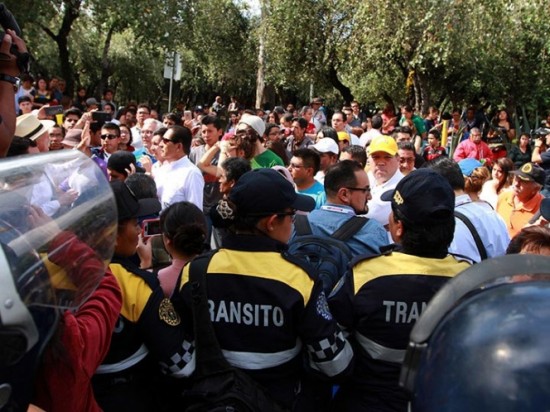 Decenas de ciudadanos se mantiene con pancartas y en ellas se lee: “Exigimos nuestros derecho al voto” y “Queremos votar”, mientras elementos de la Secretaría de Seguridad Pública de la Ciudad de México resguardan las instalaciones del INE.
