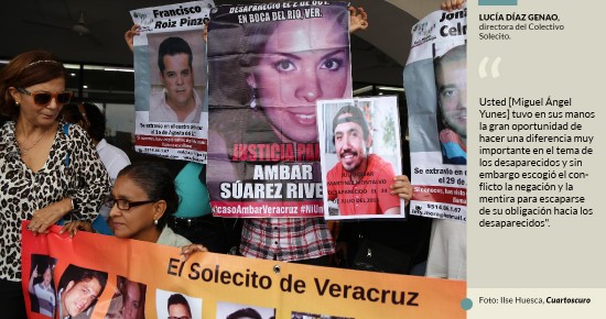 “Usted tuvo en sus manos la gran oportunidad de hacer una diferencia muy importante en el tema de los desaparecidos y sin embargo escogió el conflicto la negación y la mentira para escaparse de su obligación hacia los desaparecidos. Tanto desprecio que no se ha enterado qué hay leyes como la de Desaparición Forzada y la Ley General de Víctimas que nos amparan”, expuso el movimiento que desde hace años busca a sus hijos desaparecidos en Veracruz. El Colectivo Solecito, integrado por madres que buscan a sus hijos desaparecidos en Veracruz, envió una carta al Gobernador Miguel Ángel Yunes donde le recriminó que no cumplió ninguna de sus promesas de campaña para atender sus casos y por la descalificación de su directora, Lucía de los Ángeles Díaz Genao. También lo acusan de no comprender el dolor por el que atraviesan las familias. En la misiva, Lucía Díaz Genao aclara que el documento es una respuesta a las “calumnias y falsedades” hechas recientemente por el mandatario estatal en su contra, luego del reclamo que hicieron porque no se les informó del hallazgo de las 32 fosas donde fueron recuperados 174 cráneos el pasado jueves. Ayer, Yunes aseguró que el Fiscal general no tenía que avisarle a ningún colectivo sobre el hallazgo. Y también respondió sobre los señalamientos que difundieron sobre que la fosa había sido localizada en la zona de El Arbolillo, donde ellos pidieron hace meses que buscaran pero fueron ignorados. “Es una mentira total de la señora que lo dijo, el que el hallazgo sea en Arbolillo, forma parte de todo este discurso de mentiras que esta señora constantemente trae y da a conocer para sentirse importante, ella opina una cosa y dice hasta los nombres de quienes están ahí prácticamente”, declaró Yunes a un noticiero local. Lucía Díaz le respondió: “Señor Gobernador, usted acusa que ‘mi discurso’ está lleno de mentiras, así, sin más pruebas ni argumentos. Quiero por este medio darle un repaso de mi discurso, un discurso que nace de la necesidad imperativa, dolorosa de encontrar a nuestros hijos, cosa que usted parece no comprender, quizás por la diferencia abismal entre sus necesidades familiares y las nuestras: Usted quiere hijos gobernadores, nosotras nos conformamos con saber de los nuestros”. Díaz también se deslindó de haber difundido la versión de la ubicación de las fosas, y aseguró que ese dato salió de la prensa. “Mismo que ellos consiguieron por sus propios medios porque la fiscalía mezquina y enemiga de la libertad de expresión y del derecho a la verdad no lo quiso compartir. Fuera tan fácil aclarar todo con sólo decir la ubicación. ¿Porqué el secreto? Si Santa Fe – que es más grande- todo el mundo conoce la ubicación sin que eso haya implicado ningún problema”, le recriminó. “Ese es básicamente mi discurso, no hay una sola mentira ni falsedad en él. Yo no tengo afanes protagónicos, y sí requiero dar declaraciones porque para difundir nuestra lucha y crear conciencia es necesario hablar al público y es indispensable denunciar atropellos -como los que Ud y su fiscal cometen con nosotras porque tenemos derecho a defendernos. Mi única misión en la vida hoy en día es buscar a nuestros amados desaparecidos y encontrarlos. No tengo interés en ningún cargo político, y no lucro ni recibo beneficios económicos de ninguna índole. Mi trabajo es humanitario y honesto”, añadió. El Colectivo le recordó también a Yunes Linares que en Veracruz, las desapariciones continúan y que su Gobierno se niega a dar cifras de los casos. El grupo tiene registrados al menos 25 casos de desapariciones durante su Gobierno. Señaló también que La Ley General de Desaparición Forzada y por Particulares establece que las familias tienen derecho a participar directamente en las acciones de búsqueda. “El hecho de que usted ignore la ley, y su fiscal también, no los exime de su obligación de cumplirla”, le recrminó. YUNES ELIGIÓ EL CONFLICTO Y LAS MENTIRAS El Colectivo Solecito consideró que Miguel Ángel Yunes desperdició la oportunidad de hacer una diferencia en el tema de los desaparecidos, y que en su lugar haya tomado un discurso de “conflicto, negación y mentira”. “Usted tuvo en sus manos la gran oportunidad de hacer una diferencia muy importante en el tema de los desaparecidos y sin embargo escogió el conflicto la negación y la mentira para escaparse de su obligación hacia los desaparecidos. Tanto desprecio que no se ha enterado qué hay leyes como la de Desaparición Forzada y la Ley General de Víctimas que nos amparan”, dijo. “Usted escogió el camino de los enfrentamientos como hombre indolente e insensible que es y nosotras no íbamos a quedarnos de brazos cruzados ni calladas como tampoco lo hicimos con Duarte y demás, y nos defenderemos contra quien se requiera”, agregó. Le recordó que él ofreció “trabajar e implementar acciones múltiples que nos ayudarían a superar las deficiencias y obstáculos cuando usted se acercó a nosotras durante su campaña (tenemos las minutas de las reuniones)”. El documento detalló que Yunes Linares se comprometió a construir panteones ministeriales, a ampliar la capacidad de servicios periciales, incrementar presupuestos para investigación, búsqueda e identificación, entre otras cosas. “Jamás cumplió nada, especialmente no cumplió reunirse con nosotras de manera habitual. Sólo una vez y por breves minutos se volvió a sentar con nosotras”, acusa el Colectivo. EL FISCAL NOS ABANDONÓ El Colecitvo Solecito también denunció que la Fiscalía de Veracruz, Jorge Winckler, tiene los casos abandonados y que el Fiscal ha sido amparado por el Gobernador. “El Fiscal nos repudia, nos revictimiza, nos bloquea en redes, no tiene interlocución con nosotras. Ya lo demostramos, Ud trate de demostrar lo contrario”, dijo. “En el caso de la mala actuación del fiscal pudo usted corregirlo y solamente lo sola