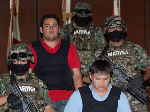 En la lista, el hijo de " El Chapo" comparte honores con Nemesio Oseguera Cervantes, "El Mencho"; Ismael Zambada García, "El Mayo Zambada", así como con Rafael Caro Quintero. "Alfredillo", uno de los dos hijos de "El Chapo", levantado el 15 de agosto de 2016 por un comando armado en el restaurante "La Leche" ubicado en Puerto Vallarta, Jalisco, es buscado por los delitos de conspiración por posesión e intento de distribuir sustancias controladas, así como por conspirar para importar y exportar sustancias controladas para su distribución. De acuerdo con la acusación radicada en la Corte del Distrito Norte de Illinois, Chicago, Jesús Alfredo Guzmán Salazar, quien se fotografió con la actriz Kate del Castillo, coordinó entre mayo de 2005 y diciembre de 2014 el trasiego de cocaína, heroína y marihuana de México a la frontera con Estados Unidos, la cual después fue introducida a territorio norteamericano. Además, el dinero obtenido por la venta de la droga, fue lavado por el capo y enviado a México y otros países en beneficio del cártel de Sinaloa y asociados. Jesús Alfredo Guzmán Salazar, quien en junio de 2012 supuestamente fue confundido con Félix Beltrán León y presentado por la Secretaría de Marina, como el hijo de "El Chapo", está incluido en una acusación conjunta en la que aparecen los nombres de 17 capos. Entre estas personas, las cuales ya fueron detenidas y algunas de ellas sentencias, se encuentra: "El Chapo" Guzmán; Heriberto Zazueta Godoy, "Capi Beto"; Víctor Manuel Félix Beltrán, "El Lic Vic"; Jesús Raúl Beltrán León, alías "Trevol" o "Chuy Raul"; así como Guadalupe Fernández Valencia, "La Patrona". Los únicos que no han sido detenidos hasta el momento es una persona identificada con el nombre de German Olivares; así como Ismael Zambada García, y Jesús Alfredo Guzmán Salazar, hijo del narcotraficante Joaquín " El Chapo" Guzmán. |