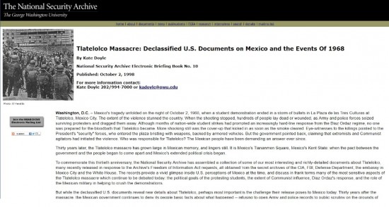 | “Mientras México reconoce el legado del movimiento estudiantil y llora la matanza de sus líderes jóvenes hace tanto, el gobierno mexicano ha sigilosamente removido, censurado y reclasificado miles de archivos previamente accesibles de esta era”, escribe Kate Doyle, directora del Proyecto México del National Security Archive (NSA). | ||||||