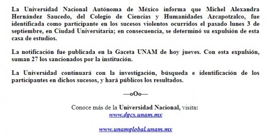 | Suman 27 expulsados de la UNAM por ataque en CU. | ||||||