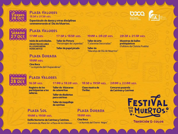 | Se contemplan diversas actividades del 26 al 28 de octubre con talleres, danza y proyecciones de cine. También harán la rodada Día de Muertos vs Hallowen (Critical Mass), el próximo 2 de noviembre con más de 500 participantes e invitan a los ciudadanos a acudir disfrazados. | ||||
