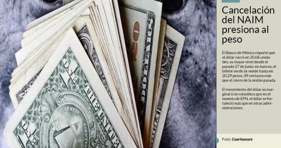 El dólar spot cerró en 20.06 unidades, su mayor nivel desde el pasado 27 de junio, mientras que en bancos se vende hasta 20.29 pesos, 49 centavos más que al cierre de la sesión pasada. El IPC (S&P BMV IPC), principal referente de la Bolsa Mexicana de Valores, tocó su nivel mas bajo desde mayo, y acumuló una baja de más 4.2 por ciento. El movimiento del peso es marginal si se considera que en el sexenio de Peña, el dólar se ha fortalecido más que en otras administraciones, desde la del Presidente Ernesto Zedillo Ponce de León: el interbancario se ha incrementado un 49 por ciento y en bancos 53 por ciento. En línea con lo esperado, el tipo de cambio y la Bolsa Mexicana de Valores reaccionaron negativamente, luego de que ayer por la noche se dieron a conocer los resultados de la Consulta Nacional sobre el futuro del Nuevo Aeropuerto Internacional de México (NAIM), que dieron un amplió revés a las obras que se construyen en Texcoco y que fueron iniciadas sin previa consulta a comunidades y ambientalistas por el Gobierno de Enrique Peña Nieto. Como resultado, el peso fue la divisa más depreciada entre los principales cruces del dólar, de acuerdo con un análisis de Banco Base y datos de la agencia Bloomberg. La moneda mexicana tuvo una caída del 3.25 por ciento; seguido del real brasileño, con un descenso del 1.90, y del rand sudafricano con 0.92 por ciento. El Banco de México (Banxico) reportó que el dólar spot cerró en 20.06 unidades, su mayor nivel desde el pasado 27 de junio, mientras que en bancos se vende hasta 20.29 pesos, 49 centavos más que al cierre de la sesión pasada. El peso registró durante la sesión su mayor depreciación diaria desde el 9 de noviembre de 2016, cuando el mercado reaccionó al triunfo de Donald Trump en las elecciones presidenciales de Estados Unidos, y borró por completo su avance anual, mostrando ahora una depreciación en el año de 2.05 por ciento. Analistas señalaron que el peso también se vio presionado por una mayor demanda del dólar en el mercado internacional, ante las preocupaciones del crecimiento económico global y factores geopolíticos como el Brexit, la aprobación del presupuesto en Italia y el resultado electoral de Brasil. Otro factor que también presionó a la divisa mexicana fue la caída en los precios del petróleo. Tanto el Texas como el Brent presentaron un descenso en gran medida por temores ante una posible desaceleración a la economía china. El Brent bajó un 0.97 por ciento, con lo que s ubicó en 76.86 dólares por barril. Mientras el Texas cayó un 0.99 por ciento y cerró en 67.04 dólares. En el mercado accionario, el IPC (S&P BMV IPC), principal referente de la Bolsa Mexicana de Valores (BMV) tocó su nivel mas bajo desde mayo, y acumuló una baja de más 4.2 por ciento a después de que el Presidente electo de México confirmara en conferencia de prensa la cancelación del Aeropuerto de Texcoco para dar paso al proyecto de pistas en Santa Lucía. El principal indicador accionario mexicano, el IPC (S&P BMV IPC), se ubicó en 43,879.13 unidades. El selectivo mexicano no registraba este nivel desde junio de 2016 y no presentaba una caída semejante para una sesión en lo que va del año. El mínimo durante 2018 para el IPC se registraba el 31 de mayo, con un nivel de 44,429 puntos, piso que ya perdió el selectivo durante la mañana de este lunes. El NAIM, considerado el “proyecto estrella” del Presidente Peña, se ha financiado con instrumentos de deuda pública, por lo que esos indicadores también reflejan incertidumbre. Esta mañana, la tasa de rendimiento de los bonos M a 10 años muestra un incremento de 14 puntos base, ubicándose en 8.49 por ciento, su nivel más alto desde septiembre de 2009. Hoy, la tasa del bono a 30 años emitido para financiar parte de la construcción del NAIM muestra un incremento de 28 puntos base a 7.11 por ciento, acumulando un incremento de 77 puntos base durante octubre. “La confirmación de la cancelación del proyecto de Texcoco podría generar presiones adicionales al alza sobre la tasa de dichos instrumentos [de deuda pública] y minusvalías en su precio, que ha bajado de 88.6 a 80.1 dólares durante el mes”. El fideicomiso del Aeropuerto Internacional de la Ciudad de México emitió 6 mil millones de dólares en cuatro bonos para financiar el proyecto del NAIM. El bono que se menciona corresponde a una emisión de 3 mil millones de dólares a 30 años, mientras que otros 3 mil millones de dólares se emitieron en tres bonos. De acuerdo con un reciente análisis de la revista The Economist, “el precio de 285 mil millones de pesos es un 70 por ciento más alto que el presupuesto original del Gobierno” de Enrique Peña Nieto, agrega. “Estas deficiencias son el resultado del proceso acelerado y descuidado [‘slapdash’, en inglés] de México para planificar y aprobar grandes proyectos. Los desarrolladores rara vez consultan a los residentes que se verán afectados por las obras o publican información sobre subcontratistas. Aunque los contratos para construir el NAIM se adjudicaron de manera transparente, las compañías que los obtuvieron no están obligadas a informar regularmente sobre su progreso”, dice la prestigiada publicación británica. “Eso alimenta una sospecha de que los costos excesivos son el resultado de la corrupción. El Gobierno publicó solo un resumen ejecutivo de su informe sobre el impacto ambiental del aeropuerto”, afirma. De acuerdo con la información que el Grupo Aeroportuario de la Ciudad de México (GACM) entregó al próximo Secretario de Comunicaciones y Transportes (SCT), Javier Jiménez Espriú, a mediados de agosto pasado, el NAIM elevó su precio original 77.5 por ciento, pero sólo hacen falta 88 mil millones de pesos. Desde un inicio, la SCT explicó que el financiamiento de la obra se haría bajo un esquema mixto: público y privado. De los 169 mil millones de pesos, 98 mil millones serían financi