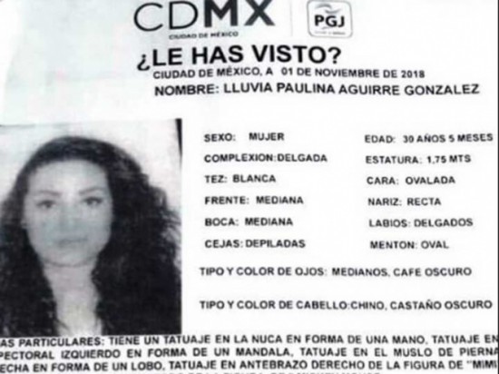 El cuerpo que fue reconocido por los familiares pertenecía al de una joven de 30 años de edad quien fue reportada como desaparecida el pasado 30 de octubre en la colonia Santa Catarina en Azcapotzalco. Un boletín del Gobierno de la Ciudad de México emitido el 1 de noviembre señala que Lluvia Paulina Aguirre fue vista por última vez el 30 de octubre en la colonia Santa Catarina en Azcapotzalco, como señas particulares para facilitar su identificación se indicó que la joven poseía al menos cinco tatuajes. La joven de complexión delgada y tez blanca tenía nariz recta, boca mediana, cabello chino castaña oscuro y ojos café obscuro. La PGJ detalló en un comunicado que tras el hallazgo de los restos se inició una carpeta de investigación en Coordinación Territorial de Tlalpan 2 bajo el protocolo de feminicidio. Agentes de la Policía de Investigación reúnen testimonios y analizan imágenes de las cámaras cercanas, a efecto de localizar al o los responsables de estos hechos, detenerlos, someterlos a proceso penal y evitar la impunidad”, agregó. El hallazgo de un cadáver más fue reportado en dicha alcaldía, en donde se encontró a una joven de entre 15 y 16 años de edad tendida en un empedrado en el camino a Pueblo San Miguel Xicalco. La víctima permanece sin identificar. |