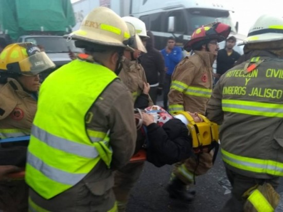 Paramédicos y uniformados de la Unidad de Protección Civil Jalisco acudieron en apoyo de los heridos que fueron trasladados a diversos hospitales; en lugar quedó la unidad de la empresa Flecha Amarilla que volcó tras impactar contra un tráiler.
