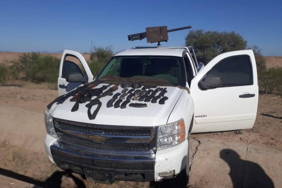 | Soldados del Ejército Mexicano encontraron la camioneta blindada y el arsenal en la región desértica del municipio de Caborca, a escasos kilómetros de la frontera entre Sonora y Arizona | ||||||