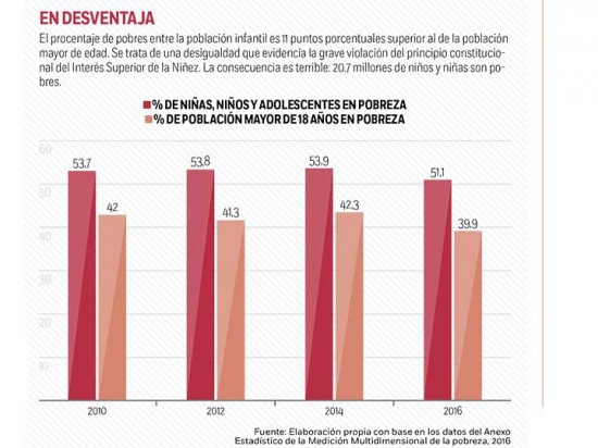 | En México hay al menos 20.7 millones de niñas y niños en pobreza; y de los 40.4 millones de menores de 18 años que había en 2016, únicamente 7.7 millones no eran pobres ni vulnerables | ||||||