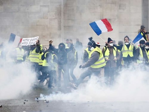Manifestantes furiosos por el alza de los impuestos se enfrentaron con la policía francesa el sábado por tercer fin de semana consecutivo. Decenas de personas fueron arrestadas luego de que pequeños grupos erigieron barricadas en calles del centro de París, encendieron fuego, arrojaron piedras a los agentes y pintaron grafitis en el Arco del Triunfo. Los manifestantes, algunos de ellos tapados con capuchas negras, apilaron grandes planchas de madera y otros materiales en medio de una calle próxima al Arco del Triunfo antes de encender los escombros. La policía disparó gases lacrimógenos para tratar de que retrocedieran los manifestantes que estaban en las inmediaciones del monumento y empleó cañones de agua cerca de los Campos Elíseos. Algunos manifestantes respondieron arrojando piedras de gran tamaño. Otros retiraron las barreras que protegían la Tumba del Soldado Desconocido de la Primera Guerra Mundial, bajo el monumento, para posar cerca de su llama eterna y cantar el himno nacional. Luego fueron dispersados por la policía. Las autoridades movilizaron a unos 5 mil agentes en París para tratar de contener las protestas. El primer ministro francés, Edouard Philippe, afirmó que algunos manifestantes atacaron a las fuerzas policiales "con una violencia poco frecuente", lo que llevó a la detención de al menos 107 personas. El ministro del Interior, Christophe Castaner, tuiteó que alrededor de la avenida de los Campos Elíseos había "mil 500 alborotadores”, fuera del perímetro de seguridad establecido por la policía. Castaner también mencionó la presencia de 200 manifestantes pacíficos, llamados 'chlecos amarillos' por los chalecos fluorescentes con los que se identifican, en los Campos Elíseos. Además del alza de impuestos, los manifestantes están molestos con el liderazgo del presidente, Emmanuel Macron. La protesta celebrada el pasado fin de semana en París también acabó en disturbios. Las movilizaciones, que comenzaron con los conductores manifestándose contra el alza de los gravámenes a los hidrocarburos, incluyen ahora una gama más amplia de demandas relacionadas con el alto costo de la vida en el país. Rabah Mendez, un manifestante que vino de un suburbio del sur para marchar pacíficamente en París, dijo que "es difícil llegar a fin de mes. La gente trabaja y paga muchos impuestos y ya estamos hartos". El poder adquisitivo está disminuyendo gravemente cada día. Y luego: impuestos, impuestos e impuestos. Y el Estado nos pide que nos ajustemos el cinturón, pero ellos, por el contrario, viven por encima de todo lo normal con nuestro dinero", reclamó Hedwige Lebrun, quien reside en París. |