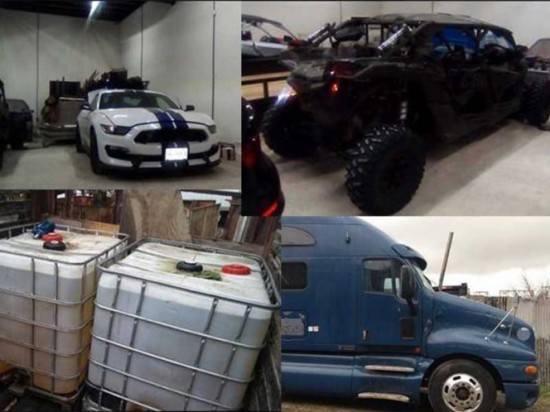 Además de la droga y el hidrocarburo, también se aseguraron 11 vehículos de lujo; un remolque; una motocicleta; un teléfono celular; así como un silenciador y un cartucho para arma de fuego.