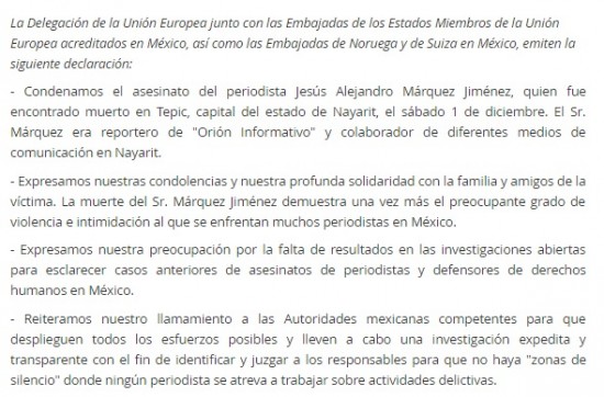 | Condenan UE, Noruega y Suiza asesinato del periodista Alejandro Márquez. | ||||||