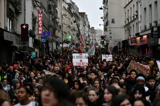 "Esperamos que nos escuchen y que anulen las reformas anunciadas", señaló Jeanne, una estudiante de último año del instituto Jean-Jaurès en Montreuil, un suburbio parisino, que lleva en su suéter una pegatina "Resistir no es un crimen". Los estudiantes, críticos con las reformas educativas del gobierno, se han sumado a la ola de descontento que recorre Francia y bloquean desde comienzo de la semana un centenar de centros de educación. Algunos profesores se unieron al cortejo. Natacha, una profesora que se declara en huelga, estima que su "puesto está junto a los jóvenes". "Hay un clima insurreccional, es el momento de expresar nuestras reivindicaciones", añade. Al llegar a la céntrica plaza de la República de París, varias decenas de jóvenes se arrodillaron, con las manos en la cabeza, en referencia al controvertido arresto de 151 jóvenes el jueves en la localidad de Mantes-la-Jolie, un suburbio al oeste de París. Estos jóvenes fueron detenidos la víspera frente a un colegio de secundaria tras violentos disturbios. Las imágenes, que circularon en las redes sociales, causaron revuelo. En ellas se ve a los jóvenes de rodillas y con las manos en alto, rodeados de policías. Los estudiantes piden que el gobierno dé marcha atrás en una reforma del bachillerato y de admisión a la universidad. |