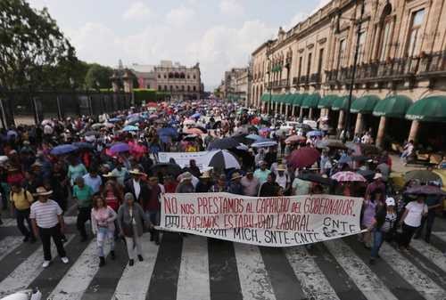 .- Miles de integrantes de la Coordinadora Nacional de Trabajadores de la Educación (CNTE); de educación media superior como Telebachillerato, Colegio de Bachilleres y Cecytem; así como empleados, académicos y jubilados de la Universidad Michoacana de San Nicolás de Hidalgo (UMSNH) iniciaron la marcha desde diferentes puntos de la capital del estado a Palacio de Gobierno, para exigir el pago de las dos quincenas de diciembre, el aguinaldo y prima vacacional.