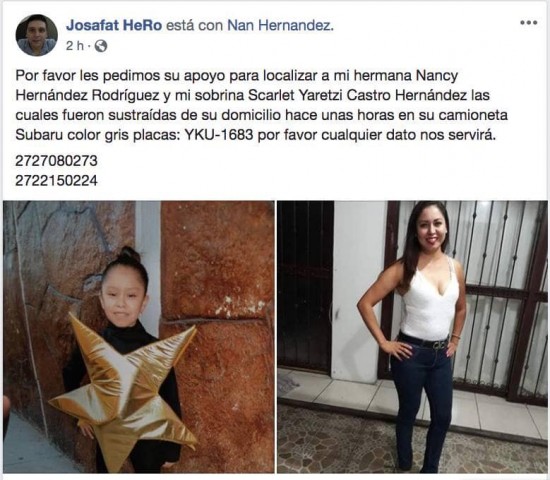 .- Angustioso llamado hacen desde Orizaba familiares de Nancy Hernández Rodríguez y su hija menor de edad Scarlett Yaretzi Castro Hernández, quienes fueron "levantadas" cuando viajaban en su camioneta con placas YKU 1683 esta noche de domingo. Sus familiares apelan a la solidaridad de los habitantes de la zona centro para que aporten algunos datos que permitan su localización, mismos que puedan aportar a los teléfonos 272-7080273 y 2722150224.