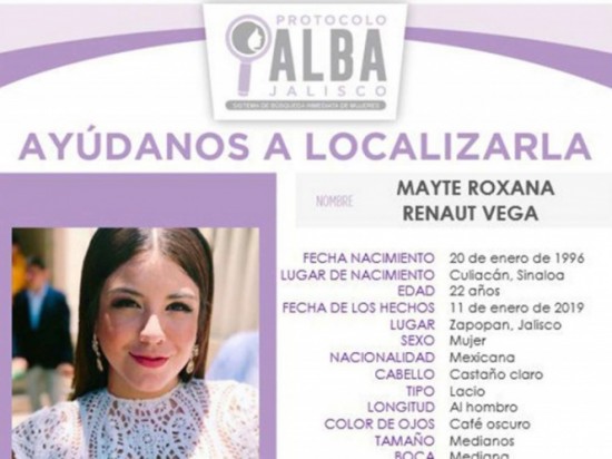 La última vez que se le vio fue el viernes en una plaza comercial. Las autoridades de Jalisco, mediante el Protocolo Alba, emitieron una ficha de búsqueda para Mayte Roxana Renaut Vega. Hasta el momento la Fiscalía estatal tiene un par de líneas de investigación.