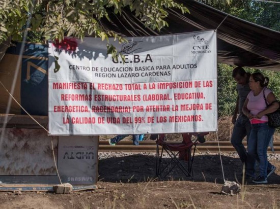 Uruapan, es otro de los municipios donde la vía del ferrocarril continúa cerrada; los profesores no atendieron la instrucción hasta conocer resultados de la Mesa de Diálogo Tripartita instalada en la Ciudad de México entre la CNTE, gobierno estatal y la federación.