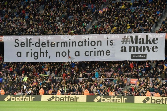 .- El Camp Nou ha exhibido una pancarta gigante en la zona lateral explicando que la autodeterminación "es un derecho" de los pueblos y "no un crimen" en los prolegómenos del partido que enfrentaba al FC Barcelona y al Valencia CF con motivo de la vigésimo segunda jornada en Primera División.