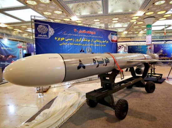 | El Ministerio de Defensa presenta el misil de crucero Hoveizeh, con un alcance superior a mil 350 kilómetros, como parte de los festejos por el 40 aniversario de la Revolución Islámica | ||||||