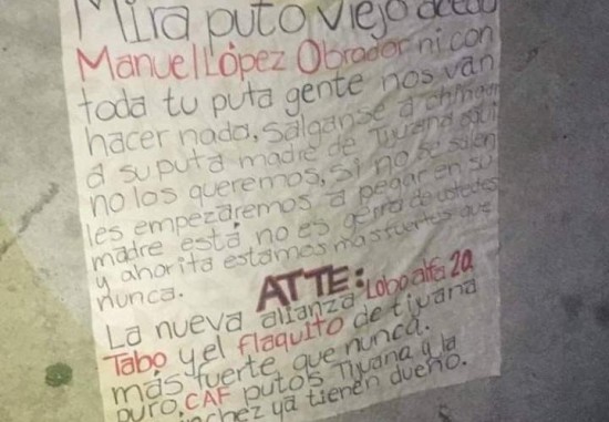 “Mira puto viejo acedo Manuel López Obrador ni con toda tu puta gente nos van hacer nada, salganse a chingar a su puta madre de Tijuana aqui no los queremos, si no se salen les empezaremos a pegar en su madre está no es gerra de ustedes y ahorita estamos más fuertes que nunca. ATTE. La nueva alianza Lobo alfa 20, Tabo y el flaquito de tijuana más fuerte que nunca. puro CAF putos Tijuana y la Sánchez ya tienen dueño”, dice el mensaje, de forma textual.