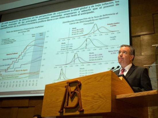 | Luego que el Banxico estimara un recorte entre 1.1 y 2.1 puntos en el crecimiento económico de México para este año, el gobernador Alejandro Díaz de León consideró que lo importante es contar con una estrategia macroeconómica ‘sólida y robusta’ | ||||||