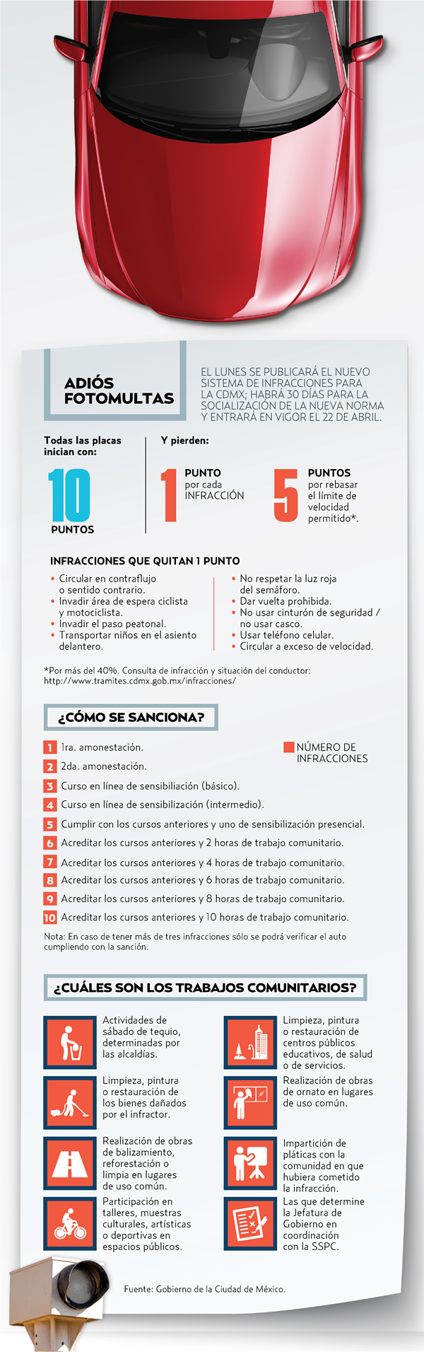 En el proyecto se contemplan cursos en línea, sensibilización presencial e incluso trabajo comunitario, según las sanciones; en caso de no cumplir con el castigo, el vehículo no podrá ser verificado hasta saldar las infracciones pendientes. Será este 18 de marzo cuando se oficialice en la Gaceta. Habrá 30 días de socialización, por lo que hasta el 22 de abril se aplican sanciones. En conferencia de prensa, la jefa de Gobierno, Claudia Sheinbaum, y el secretario de Movilidad, Andrés Lajous, detallaron la forma en que va a funcionar. Lajous explicó que las placas inician con 10 puntos. Por cada infracción registrada por cámaras y radares equivale a un punto. Entre las infracciones que ameritan una sanción de sólo un punto son circular en contraflujo o sentido contrario, invadir área de espera ciclista y motociclista, invadir el paso peatonal, transportar niños en el asiento delantero. Las sanciones tendrán un castigo automático de cinco puntos cuando se rebase el límite de velocidad por más de 40% de la velocidad máxima autorizada. En todos los casos, las primeras dos sanciones serán amonestaciones, mientras que la forma que se pueden subsanar las faltas al reglamento de tránsito para tener derecho a verificar son: siete y seis puntos restantes, cursos en línea; cinco restantes, sensibilización presencial; cuatro, tres, dos y un puntos restantes: dos horas de trabajo comunitario cada uno. Lajous afirmó que las infracciones que no se cumplan se acumularán por cada ciclo de verificación vehicular y para poder verificar en ese periodo, será necesario redimir todas las sanciones acumuladas. Sin embargo, los puntos son acumulativos y se restablecen tras cada periodo de verificación, no tras el cumplimiento de las sanciones. El secretario de Movilidad precisó que se mantienen como sanciones económicas las infracciones registradas por hand held, por invasión al carril confinado de Metrobús, a placas de: personas morales, de transporte público, de transporte de carga, de taxi y de otra entidad federativa o país.