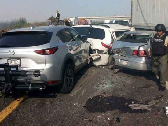 Las cinco personas que perdieron la vida viajaban en una camioneta que fue prensada entre dos tráilers; un hombre de 30 años, dos mujeres de 20 y 40 años y dos menores; un niño de ocho años y una niña de 2 años de edad. El accidente ocurrió a las 3 de la tarde y de acuerdo con testigos se debió a la escasa visibilidad provocada por la quema de pastizales que se realizaba en la zona por lo que comenzó la colisión entre las unidades que circulaban a alta velocidad. La secretaria de Proteccion Civil Xóchitl Osorno Martínez indicó que fue enviado un helicóptero para trasladar a una mujer, que se encontraba gravemente herida al hospital del ISSSTE en el puerto de Veracruz. Cuatro menores de edad se encuentran entre los lesionados, con heridas severas como estallamiento de vísceras y traumatismo craneoencefálico. Todos los heridos fueron trasladados a diversos hospitales de la zona, tanto en Cardel como en Veracruz. El vehículo con más daños fue una camioneta que quedó totalmente aplastada entre dos tráilers. Al sitio llegaron cuerpos de bomberos de Veracruz de Cardel y de Xalapa así como diversos enlaces regionales y apoyaron en las labores con la Cruz Roja policía federal y la secretaría de seguridad pública. La circulación en el libramiento de Cardel se mantuvo cerrada durante más de seis horas, para realizar las labores de retiro de las unidades y recuperación de los restos de las personas fallecidas. LISTADO DE PERSONAS LESIONADAS: - Trasladados al IMSS de Cardel: 1.- Aldaír Montero González. 2.- Oscar Serrano Aguerta. 3.- Israel Chávez Hernández. 4.- Mario Sánchez Garrido. 5.- Antonio Cortés Sosa. 6.- Carolina Quirarte Tirado. 7.- Delfino Flores Fuentes. 8.-María Luisa Sánchez Miranda. 9.- Arturo González Álvarez. 10.- Helen Itzel Menjivar Rodríguez, menor de edad. 11.- Marco Javier Menjivar, menor de edad. 12.- Ulises Gutiérrez Molina, menor de edad. 13.- Ian Gael Gutiérrez Molina, menor de edad. - Trasladados al Hospital Regional: 1.- Carlos Antonio Gapi de 22 años de edad, albañil, con domicilio en Puerto de Veracruz. 2.- Mirna Odín Godínez Chávez de 45años, presentó fractura en tibia y peroné. 3.- Humberto Gómez de 47 años, presentó fractura de fémur y húmero lado izquierdo, de la Ciudad de México. 4.- Karen Rodríguez Díaz de 25 años, presentó fractura de cadera. 5.- Marcos Rodríguez Pegeros de 50 años de Puebla. - Trasladada al ISSSTE Veracruz: 1.- Mujer sin generales, fue trasladada en ambulancia área. |
