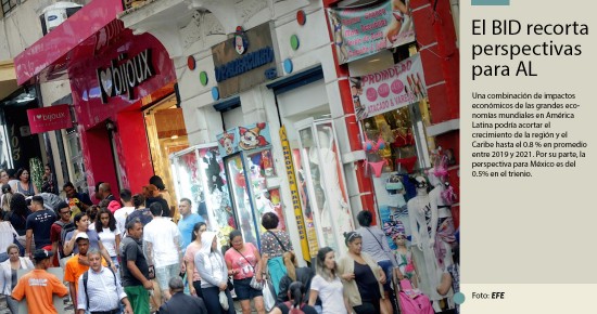 El crecimiento económico esperado por el Gobierno de México para 2019 se localizó entre el 1.1 y un 2.1 por ciento, cuatro décimas menos que la previsión anterior del 1.5 al 2.5 por ciento, y aunque el Presidente López Obrador exponga que “la proyección que presentó Hacienda al Congreso es un estimado prudente”, el pronóstico de las instituciones no llega a los 2 puntos porcentuales. Para el BID, una combinación de impactos económicos de las grandes economías mundiales en América Latina y el Caribe podría acortar el crecimiento de la región hasta el 0.8 por ciento, en promedio, entre 2019 y 2021, y para México el pronóstico se colocó en un crecimiento de solo medio punto porcentual. El BID recortó sus pronósticos para la región en un 1.7 por ciento, principalmente por el posible efecto de la desaceleración en Estados Unidos y China, y un hipotético aumento de las tasas de interés de la Reserva Federal estadounidense (Fed). El estudio también evaluó los potenciales impactos sobre América Latina y el Caribe causados por un “brexit” (salida del Reino Unido de la Unión Europea) sin acuerdo, que podría reducir en medio punto porcentual adicional las proyecciones de desarrollo de la región. “Los potenciales impactos son alarmantes porque América Latina y el Caribe ya se encuentra entre las regiones con índice de crecimiento anual más lentos del mundo”, señaló en el informe Eric Parrado, economista jefe del BID. Según el banco de desarrollo, la ralentización de la economía estadounidense puede tener un impacto negativo del 0.8 puntos en Latinoamérica, mientras que el menor desarrollo de China afectará en un 0.5 por ciento en el trienio estudiado. Estos dos factores, sumados a un impacto del 0.4 por ciento del precio de los activos, resultará en una disminución del avance del PIB regional del 1.7 por ciento, hasta el 0.8, para el periodo establecido. La zona de la región que se verá más afectada por el impacto de Estados Unidos y China será el Cono Sur (excluyendo a Brasil), cuya economía se puede llegar a contraer un 0.4 por ciento. Sin embargo, Parrado apuntó que el BID ha trazado un rumbo “por el cual la región puede obtener un gran impulso económico a través de inversiones en transporte, telecomunicaciones y otras obras de infraestructura tan necesarias”. De este modo, el informe subraya que aunque la inversión pública se encuentra frenada por presupuestos acotados, las oportunidades de obtener financiación privada son “amplias en un contexto de tasas de interés bajas en todo el mundo”. Para la región en promedio, los cálculos indican que de ser capaces los países de incrementar sus niveles de inversión en los sectores de infraestructura lo suficiente como para cerrar la brecha con países de la Organización para la Cooperación y el Desarrollo Económicos (OCDE), la productividad en toda la economía crecería un 75 por ciento con respecto al promedio histórico. OTRAS PREVISIONES El pronóstico de Banco Base para este año es de 1.3 por ciento, “sobre todo porque vemos que la confianza empresarial está deprimida y que, seguramente, la inversión no crecerá este año y más bien caerá. Igual la confianza del consumidor está en máximos históricos, pero esto no se ha visto reflejado en el consumo y las exportaciones dada la desaceleración económica en Estados Unidos también esperamos que se desaceleren”, Gabriela Siller, directora de análisis económico-financiero de la institución Hasta el 1.4 por ciento recortó su perspectiva de crecimiento económico BBVA Bancomer para México en este 2019, debido al retraso en la recuperación de las inversiones y por un menor dinamismo en el sector exportador de manufacturas. La misma previsión que ofrece Casa de Bolsa Finamex. “Esta estimación contempla un escenario inercial de acuerdo al crecimiento observado en los últimos años e incorpora efectos asociados a la desaceleración que típicamente se observa cuando hay un cambio en la administración del gobierno federal. Entre estos efectos se ha observado históricamente cierta desaceleración en el gasto público que tiene algún impacto sobre el consumo. Asimismo, hay que notar que la inversión ha tenido un crecimiento muy acotado en los últimos años por diferentes factores, por lo cual permanecerá como un reto durante este año observar si esa tendencia se revierte”, explicó Jessica Roldán Peña, directora de análisis económico de la firma a Mónica G. Moreno de Economía Hoy. Aunque la experta de Finamex cree que el balance de riesgos para su estimación está sesgado a la baja, es importante notar que, “en línea con nuestra estimación de actividad trimestral, los datos de crecimiento que hemos observado para los componentes de la demanda agregada –consumo, inversión, gasto público y exportaciones netas– a enero son consistentes con nuestra estimación actual de crecimiento durante 2019”. Después de un recorte de cinco décimas, para el Fondo Monetario Internacional (FMI) la economía mexicana crecerá un 1.6 por ciento este año, debido a la incertidumbre que sobrevuela sobre algunas políticas del presidente, Andrés Manuel López Obrador. En México “el sentimiento de los mercados se deterioró y los diferenciales soberanos subieron cuando el gobierno entrante canceló la construcción del aeropuerto planificado para la capital y dio marcha atrás con las reformas energéticas y educativas”, señaló el Fondo. El Banco Mundial esperó que la economía mexicana crezca un 1.7 puntos porcentuales en 2019, desde el 2 por ciento anterior, lo que según la institución refleja principalmente las preocupaciones de los mercados por las señales un tanto contradictorias con respecto al curso futuro de la política económica. “Las señales de la nueva administración han sido mixtas y solo el tiempo dirá qué orientación prevalecerá. Pero, mientras tanto, es probable que l