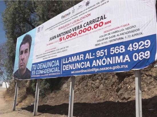 | Son al menos 10 espectaculares con la fotografía del empresario Vera Carrizal, su media filiación y la recompensa de hasta un millón de pesos | ||||||